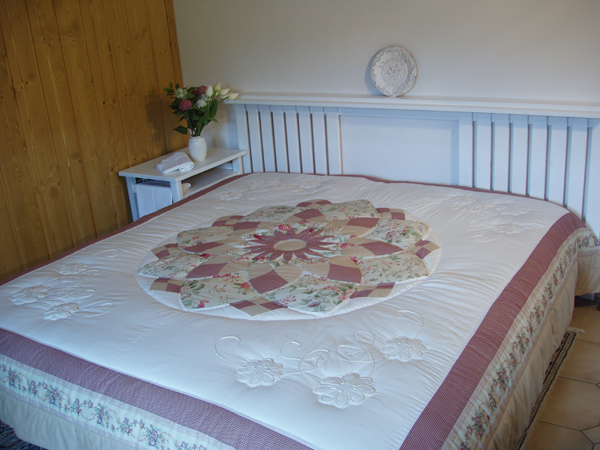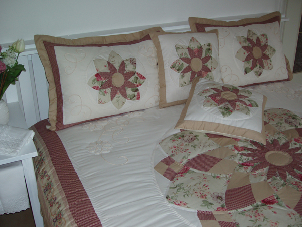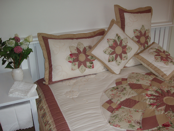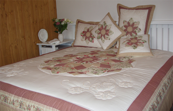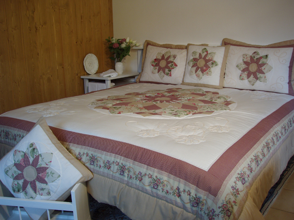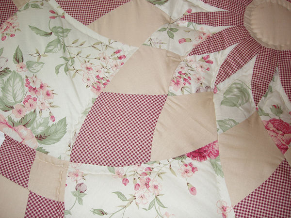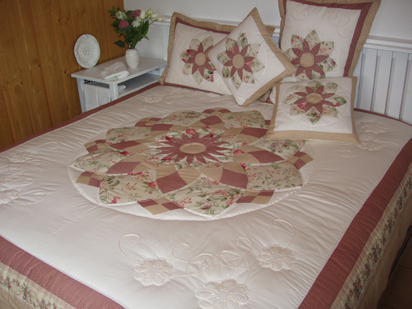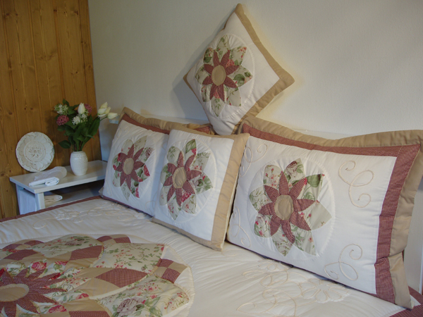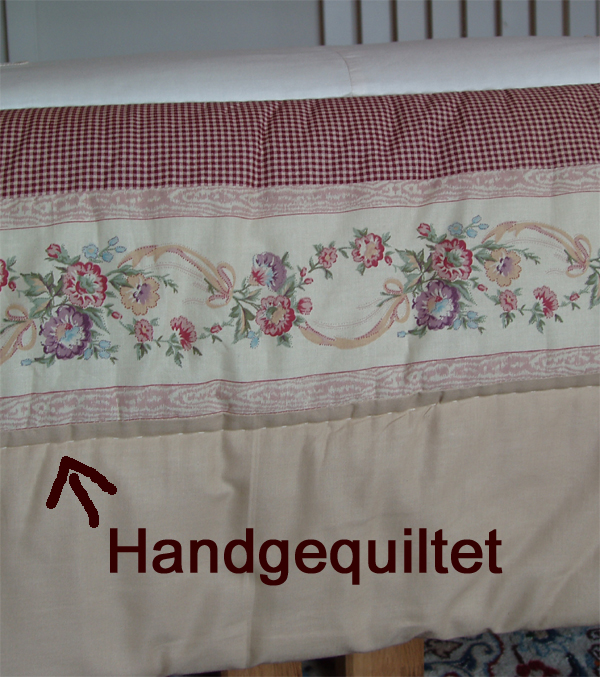 Handgequiltet = von Hand durchgesteppt, so wird die Oberseite mit der Vliesfüllung und der Unterseite verbunden.